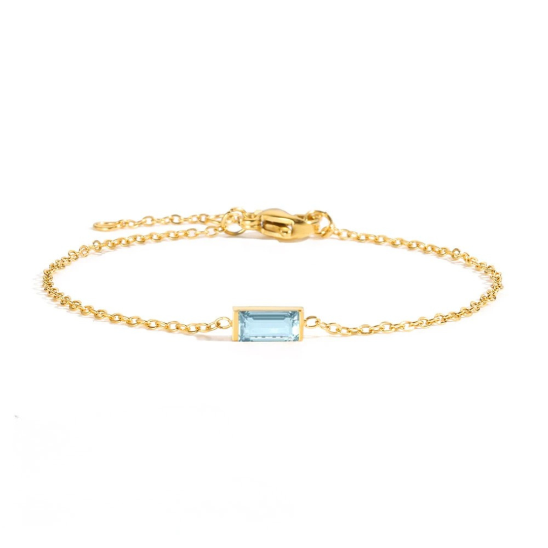 Meaningful, minimalist, and effortlessly chic — the Birthstone Bar Bracelet is the perfect way to carry a personal touch of color and symbolism with you every day. Each bracelet features a sleek rectangular stone representing your birth month, set on a delicate gold-finish chain that adds just the right amount of shine.