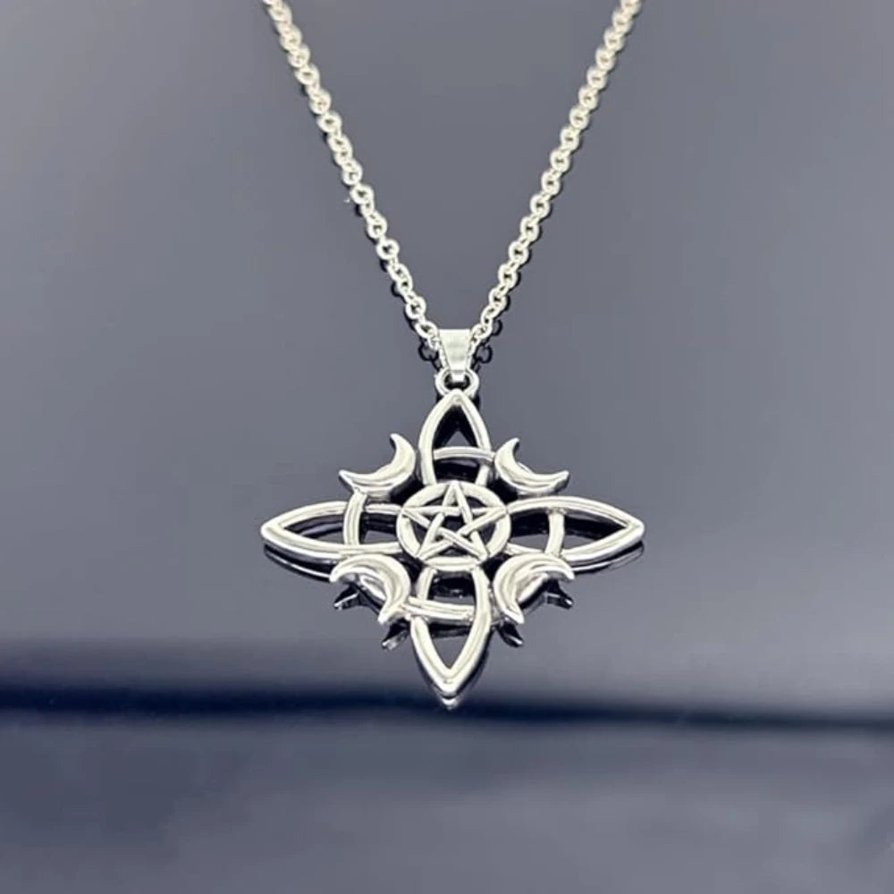The openwork structure gives the pendant a light, ethereal presence while maintaining a strong, protective character. Each element—the star, the moons, and the intersecting curves—works together to symbolize guidance, intuition, and inner strength. Finished in a polished silver-tone metal, it reflects light beautifully and pairs effortlessly with both everyday wear and statement looks.